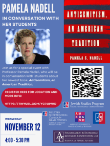 American University welcomes its award-winning Professor Pamela S. Nadell for a conversation with her students about her timely and compelling new book Antisemitism, an American Tradition. Nadell explores the deep roots of antisemitism in the U.S.—from colonial times to the present—and the powerful ways in which Jewish communities have resisted hatred and bigotry and discusses how the powerful impact of teaching this subject while writing this book..